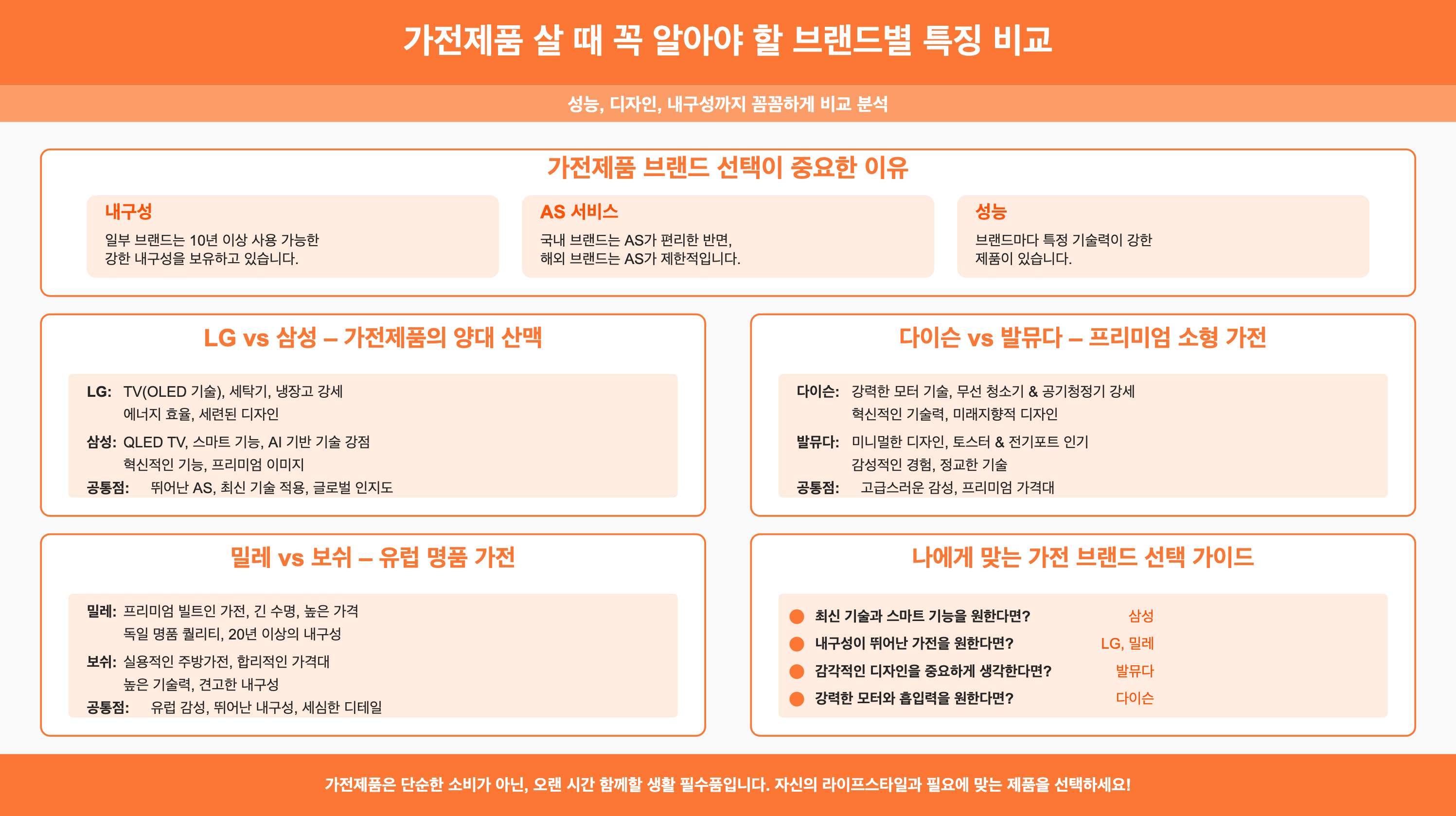가전제품 구매, 브랜드별 차이를 아는 것이 핵심! 성능, 디자인, 내구성까지 꼼꼼하게 비교해봤습니다.