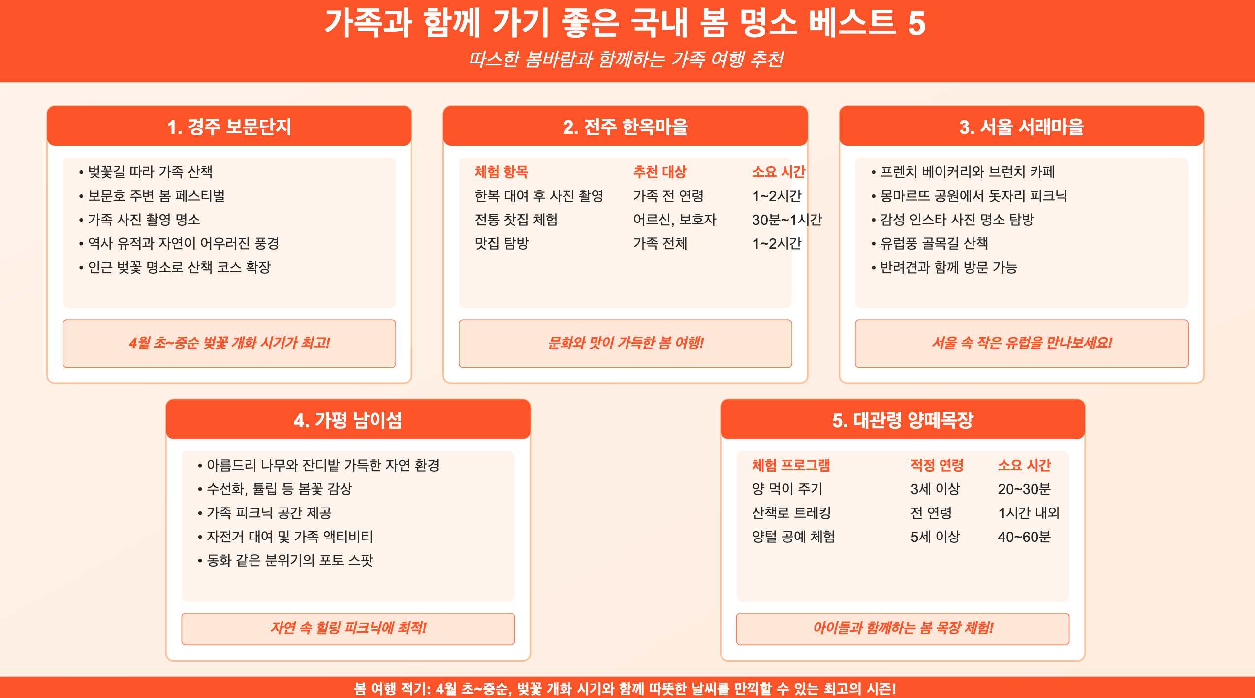 따뜻한 햇살, 싱그러운 바람, 가족과 함께하는 웃음소리. 봄은 그 자체로 선물이지만, 어디서 어떻게 보내느냐에 따라 더 특별해질 수 있어요. 오늘 소개해드린 국내 봄 명소들, 여러분의 가족에게도 행복한 기억이 되기를 진심으로 바랍니다. 혹시 다녀오셨거나 다른 추천 장소가 있다면 댓글로 나눠주세요. 우리 같이 더 좋은 봄 여행지 발굴해봐요 :)