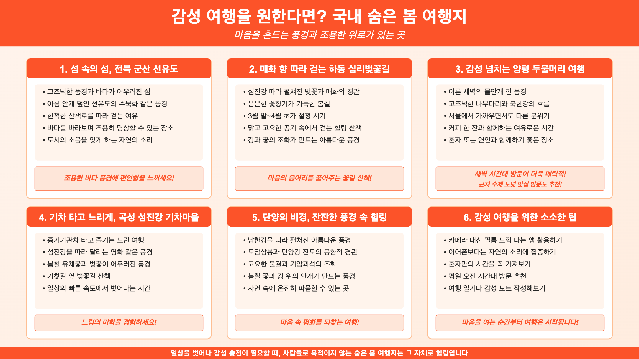 일상을 벗어나 감성 충전이 필요할 때, 사람들로 북적이지 않는 숨은 봄 여행지는 그 자체로 힐링이죠. 이번 글을 통해 여러분도 나만의 시간을 오롯이 보낼 수 있는 따뜻한 봄날의 여행지를 하나쯤 찾으셨길 바라요. 여행은 멀리 있는 게 아니라, 마음을 여는 순간부터 시작되는 것 같아요. 지금 이 계절, 놓치지 말고 꼭 한번 떠나보세요. 그리고 여러분만의 감성 포인트도 댓글로 공유해 주세요. 함께 더 많은 설렘을 나누면 좋겠어요 🌸
