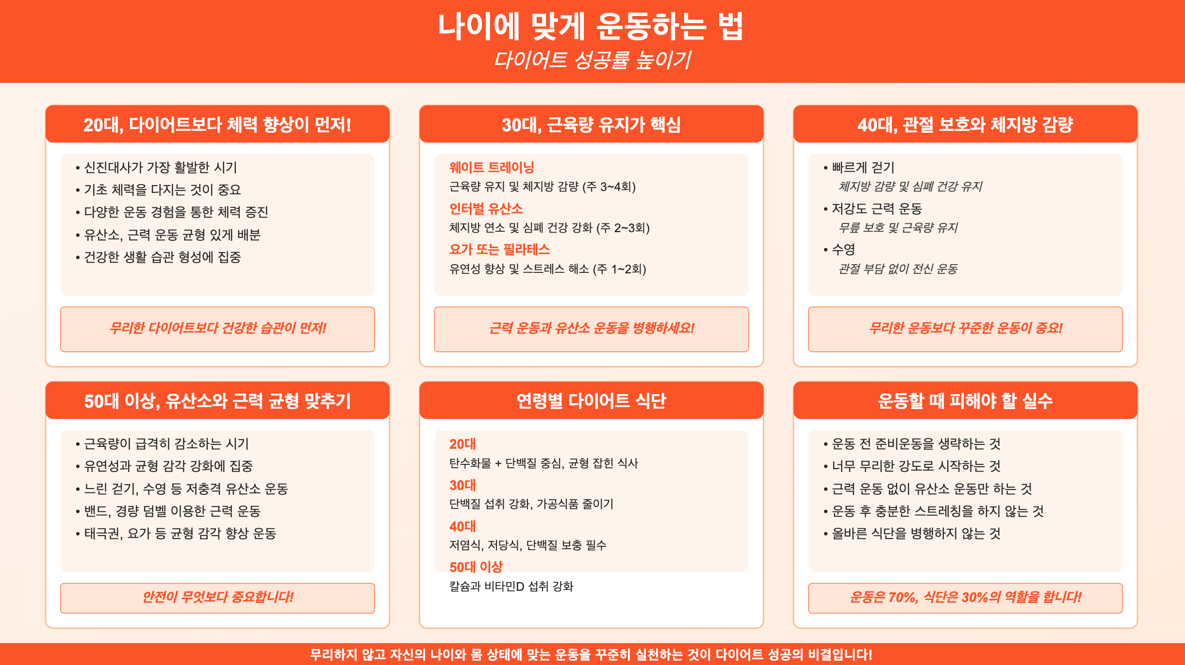 운동은 나이에 따라 전략을 달리해야 합니다. 20~30대는 체력 향상과 근육량 증가에 집중하고, 40대 이후에는 관절 보호와 신진대사 유지를 고려해야 합니다. 중요한 것은 꾸준함입니다! 무리하지 않고 자신의 몸에 맞는 운동을 찾아서 건강한 다이어트를 실천해보세요. 😊💪