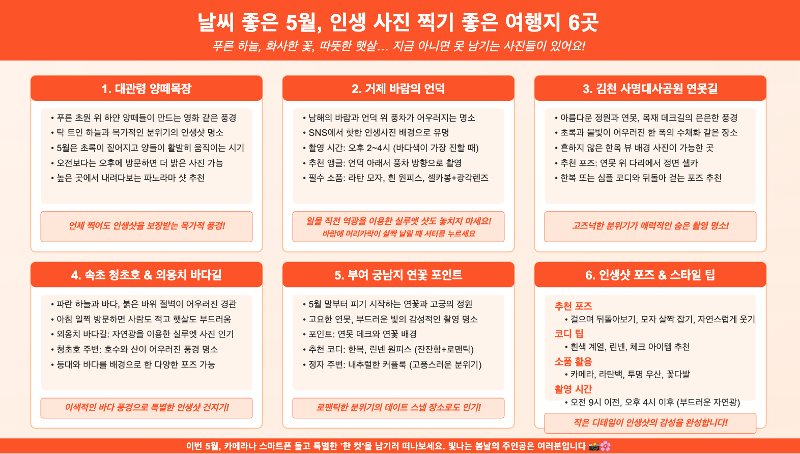 안녕하세요, 카메라 들고 여행 떠나는 걸 가장 좋아하는 블로거입니다 :) 5월은 그야말로 ‘사진 맛집’의 계절이에요. 맑은 하늘과 초록의 자연, 그리고 반짝이는 햇살이 모든 풍경을 작품으로 만들어주는 시기죠. 인생샷 한 장 건지고 싶은 분들, SNS 감성 가득한 배경을 찾고 있는 분들께 오늘은 5월에 꼭 가봐야 할 인생 사진 여행지 6곳을 소개할게요. 위치부터 추천 촬영 시간, 포즈 팁까지 함께 담았으니 메모 준비하시고 따라오세요!