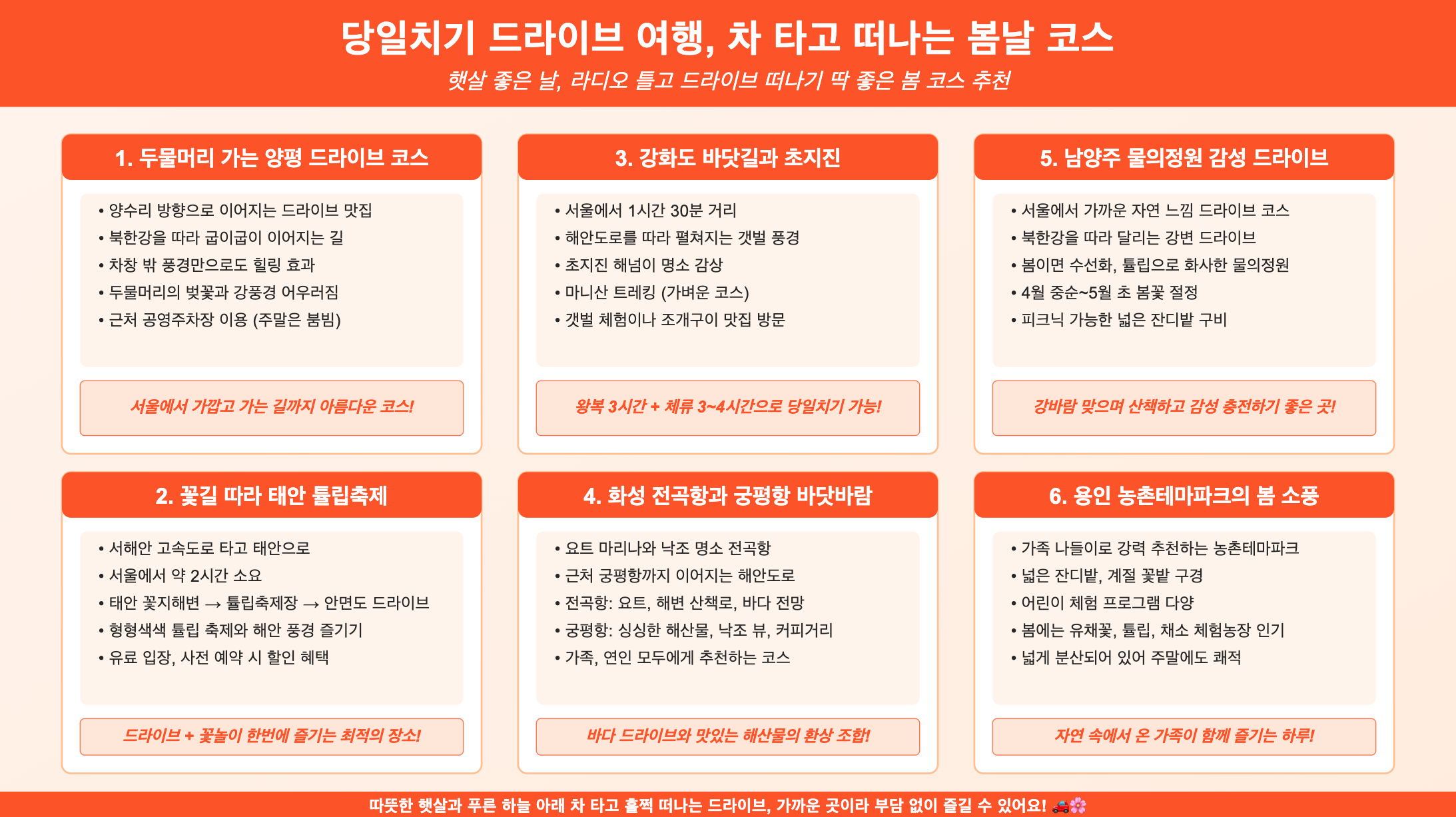 따뜻한 햇살과 푸른 하늘 아래 차 타고 훌쩍 떠나는 드라이브, 생각만 해도 설레지 않나요? 오늘 소개한 6곳은 당일로도 충분히 다녀올 수 있는 봄맞이 드라이브 명소들이에요. 가까운 곳이라 부담 없이 떠날 수 있고, 가는 길마저 즐거운 곳들이라 더 특별하답니다. 이번 주말엔 가벼운 옷차림과 음악 한 곡 챙겨서, 당신만의 봄길을 달려보세요!