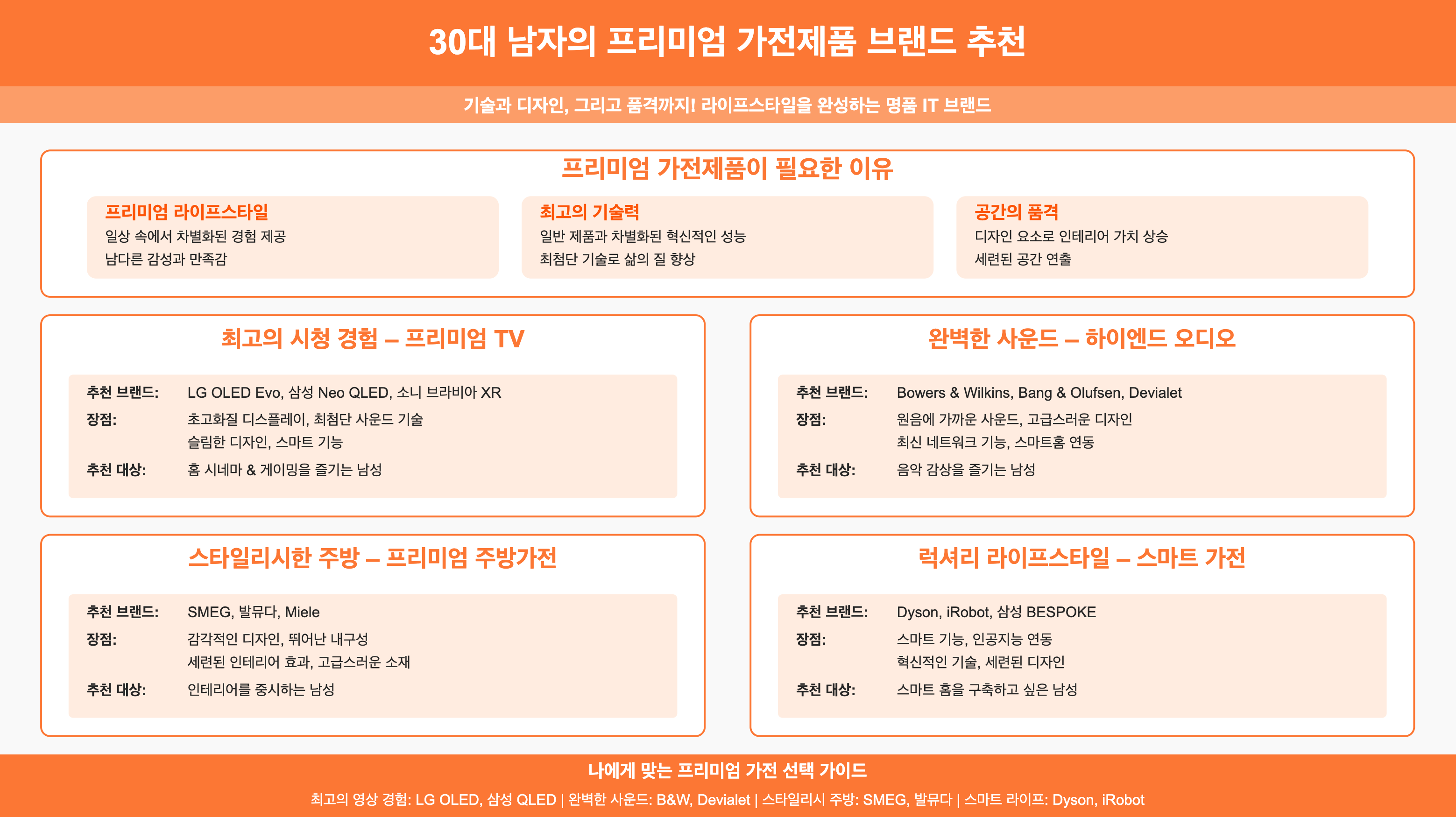 30대 남성들에게 가전제품은 단순한 생활 필수품이 아닙니다. 고급스러운 디자인, 최고의 성능, 차별화된 브랜드 가치를 갖춘 프리미엄 가전은 삶의 질을 높이고, 공간의 품격까지 끌어올리는 중요한 요소죠.
