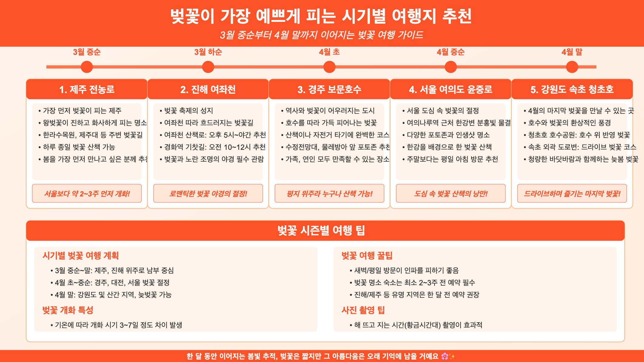 안녕하세요! 봄만 되면 벚꽃 지도부터 확인하는 여행 마니아입니다. 해마다 벚꽃은 우리에게 짧고 강렬한 감동을 주는데요, 같은 벚꽃이라도 ‘언제 어디서 보느냐’에 따라 그 감동의 깊이가 다르답니다. 그래서 오늘은 전국 벚꽃 여행지를 시기별로 정리해봤어요. 3월 중순부터 4월 중순까지 이어지는 벚꽃 시즌을 한 달 내내 즐길 수 있도록 남부에서 중부, 그리고 서울까지 순서대로 소개해드릴게요. 이 글 하나면 봄날 벚꽃 여행 준비 끝!