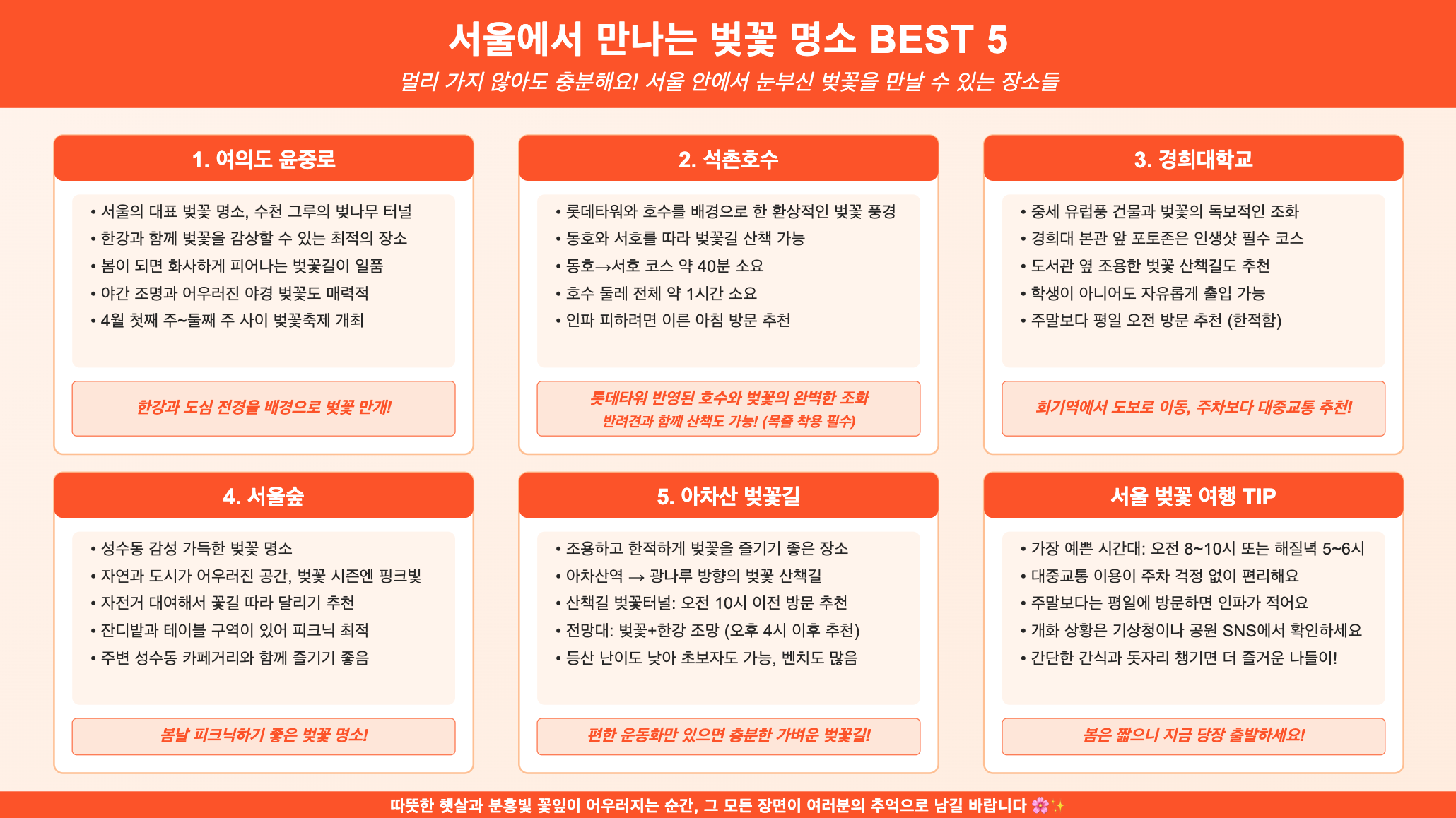 굳이 멀리 가지 않아도, 서울 안에서도 충분히 봄의 낭만을 즐길 수 있다는 것, 이제 아시겠죠? 잠깐의 산책으로도 기분전환이 되는 벚꽃길, 나만의 봄 사진을 남기고 싶은 분들께 이번 글이 도움이 되었길 바랍니다. 따뜻한 햇살과 분홍빛 꽃잎이 어우러지는 순간, 그 모든 장면이 여러분의 추억으로 남길 바랄게요. 봄은 짧으니까요. 오늘 당장 꽃길로 나서보세요 🌸✨