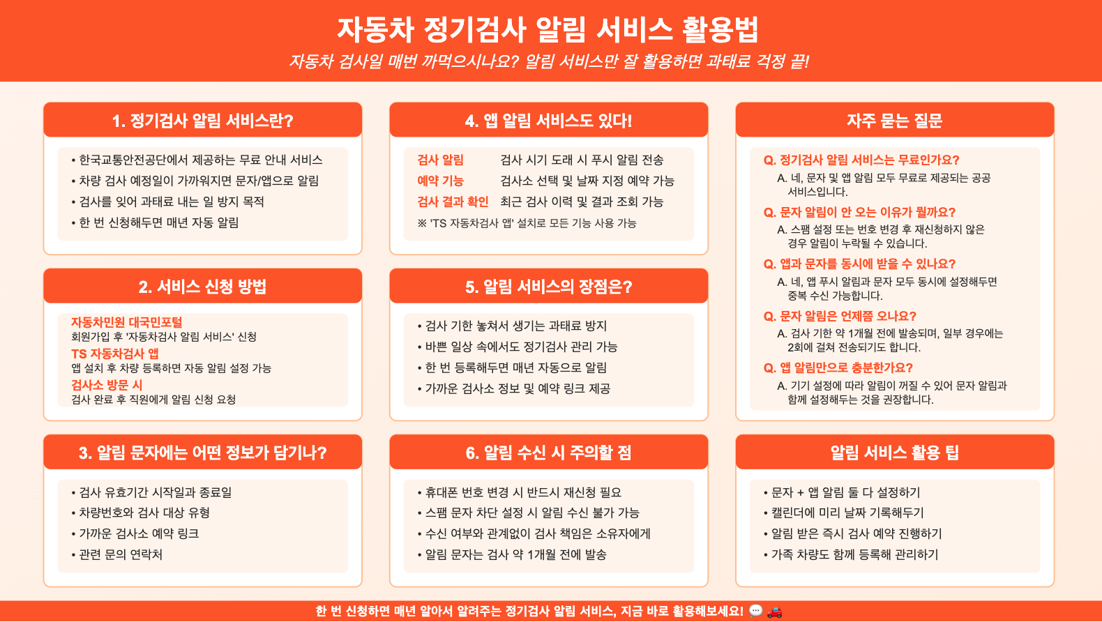자동차 검사일 챙기는 게 어렵게 느껴졌다면, 오늘 알려드린 ‘정기검사 알림 서비스’를 꼭 활용해보세요. 한 번 신청만 해두면 매년 알아서 알려주니 진짜 마음이 편해져요. 검사일 놓쳐서 벌금 내는 일, 이젠 안 해도 되죠. 특히 앱까지 함께 쓰면 예약, 결과 확인까지 한 번에 가능하니 완전 추천이에요. 여러분도 지금 바로 알림 신청하고 내 차 건강, 확실하게 챙겨보세요!