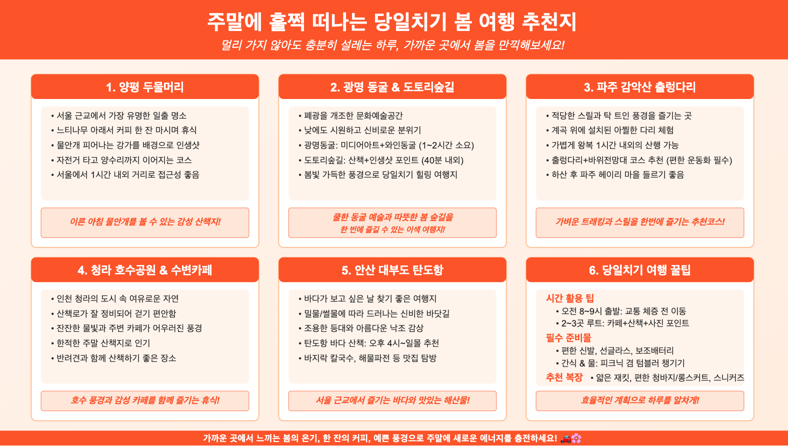 여행은 꼭 멀리 가야만 하는 건 아니죠. 가까운 곳에서 느끼는 봄의 온기, 한 잔의 커피, 예쁜 풍경 속 셀카 한 장이 우리의 일상에 새로운 에너지를 더해줍니다. 오늘 소개한 당일치기 여행지로 이번 주말엔 가볍고 행복한 하루를 만들어보세요. 봄은 길지 않아요, 잠깐이라도 나를 위한 여행을 떠나보는 거 어때요? 🚗🌸