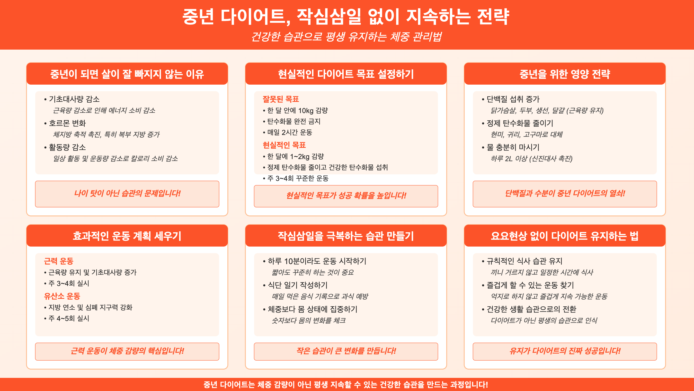 중년 다이어트는 단순한 체중 감량이 아니라, 평생 지속할 수 있는 건강한 습관을 만드는 과정입니다. 급격한 다이어트보다는 현실적인 목표를 설정하고, 꾸준한 실천을 통해 건강을 지키는 것이 중요합니다.