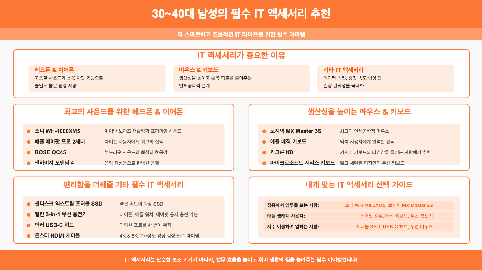 더 스마트하고 효율적인 IT 라이프를 위한 필수 아이템! 헤드폰부터 마우스까지, 30~40대 남성을 위한 최고의 IT 액세서리를 추천합니다.