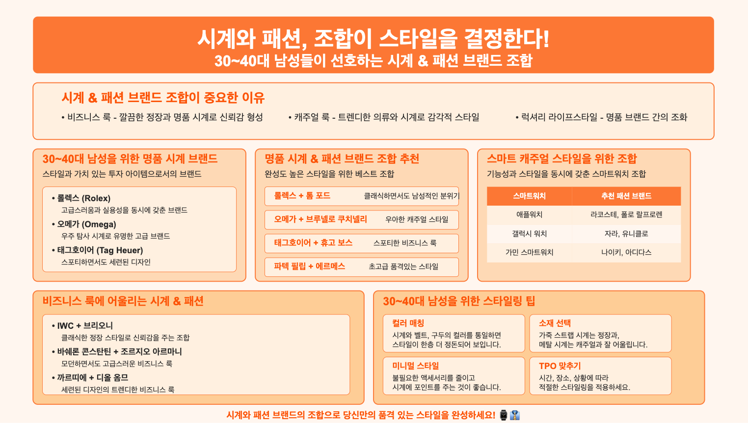 명품 시계와 패션 브랜드를 조합하면 더욱 완성도 높은 스타일을 연출할 수 있습니다. 다음은 30~40대 남성들에게 추천하는 시계 & 패션 브랜드 조합입니다.