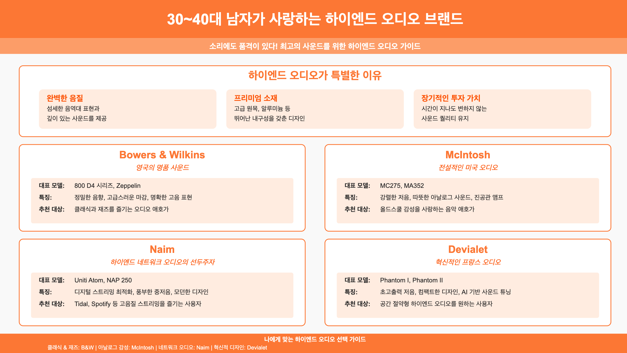 하이엔드 오디오는 각 브랜드마다 개성이 다릅니다. 자신의 음악 취향과 라이프스타일에 맞춰 최적의 브랜드를 선택해보세요!