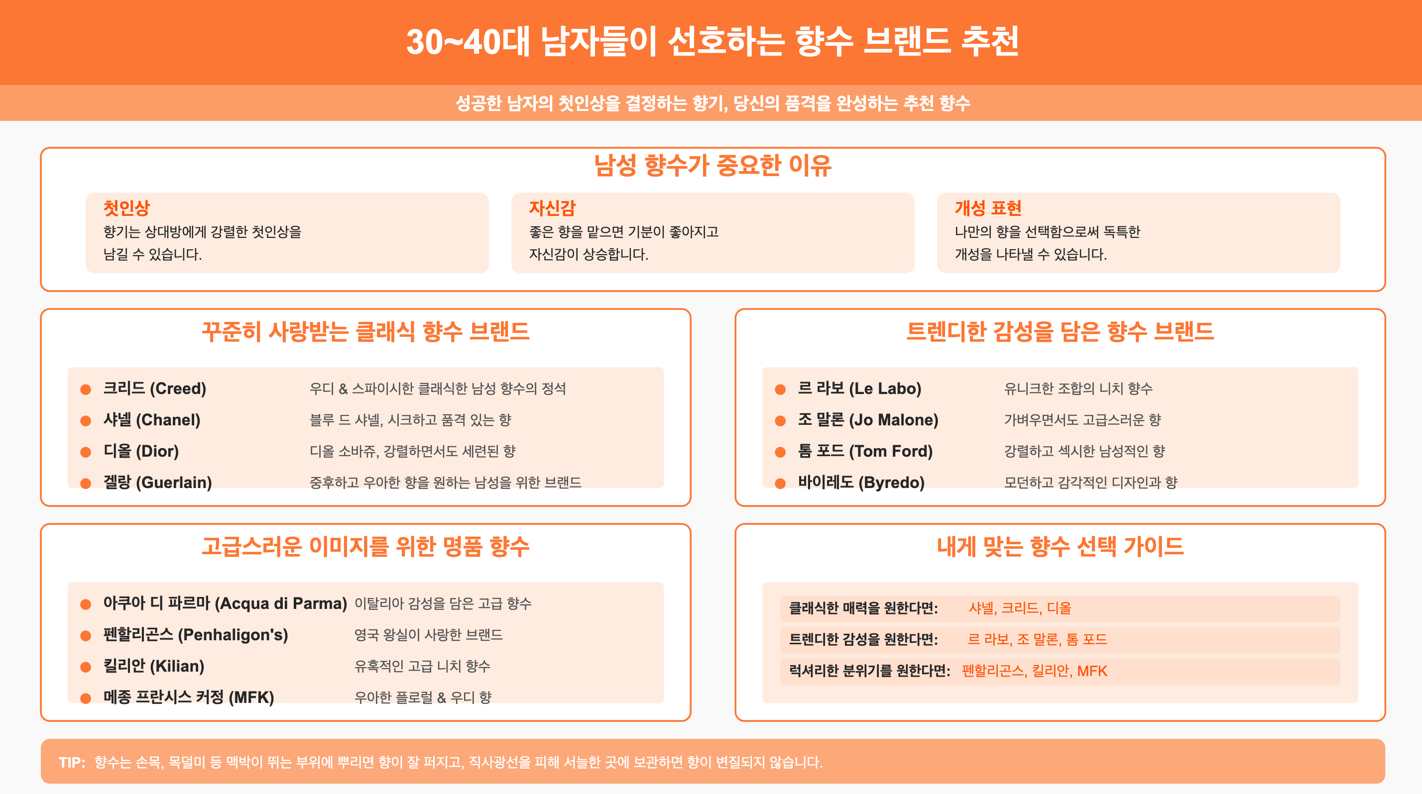 향수는 단순한 액세서리가 아니라, 남자의 개성과 스타일을 표현하는 중요한 요소입니다. 클래식한 매력을 원한다면 **샤넬, 크리드, 디올**, 트렌디한 감성을 원한다면 **르 라보, 조 말론, 톰 포드**, 럭셔리한 분위기를 원한다면 **펜할리곤스, 킬리안, MFK**를 선택해보세요. 여러분은 어떤 향수를 선호하시나요? 댓글로 의견을 남겨주세요!