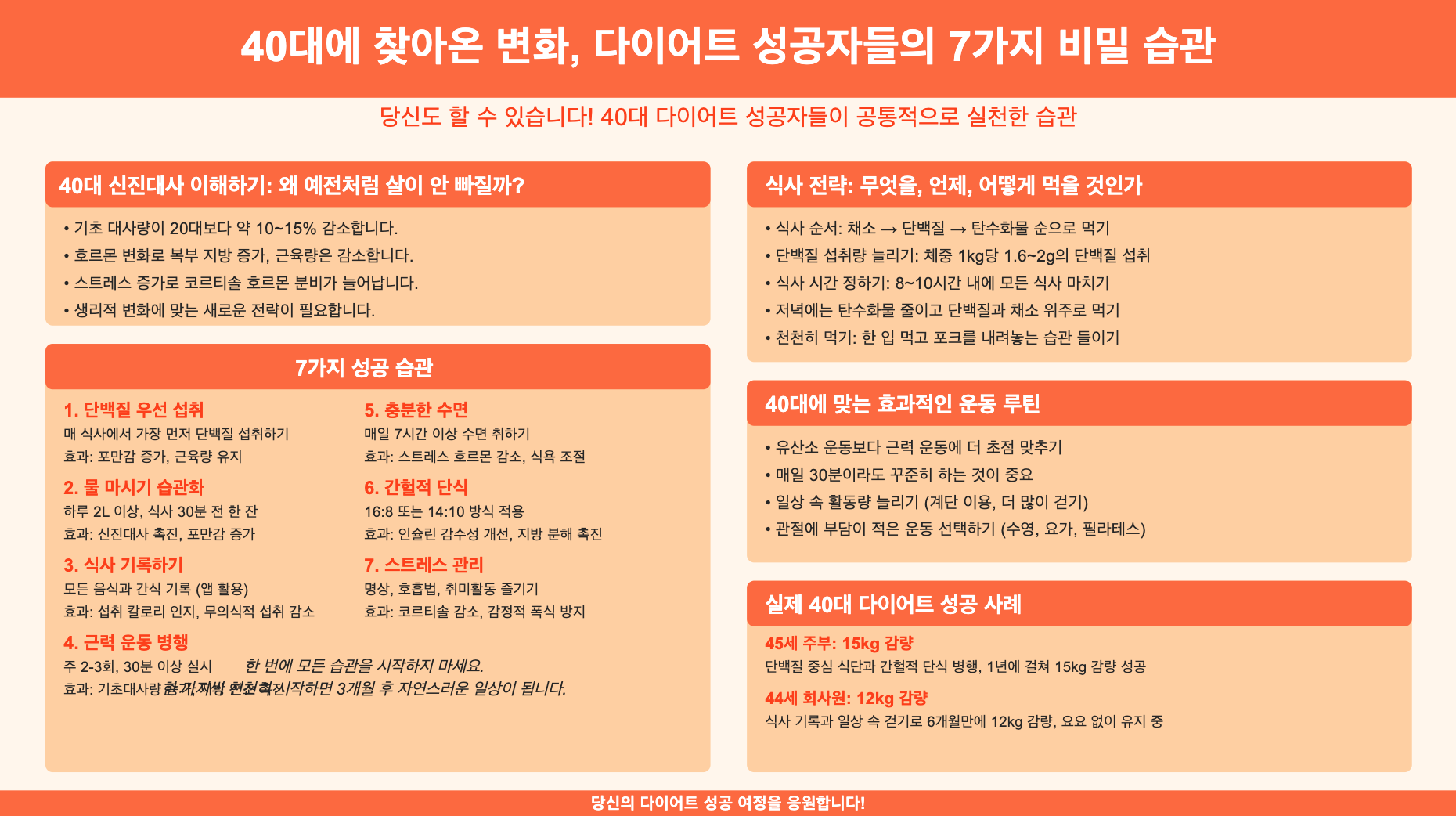 안녕하세요, 여러분! 오늘은 제가 정말 오래 고민해온 주제에 대해 이야기해보려고 해요. 40대가 되니 갑자기 찾아온 살과의 전쟁이 시작됐거든요. 예전엔 하루 굶으면 1kg 빠지던 시절이 있었는데... 이제는 일주일 열심히 관리해도 체중계 숫자는 꿈쩍도 안 하더라구요. 그래서 저는 실제로 40대에 다이어트에 성공한 분들을 만나 그들의 비법을 취재했답니다. 놀랍게도 성공한 사람들 사이에는 공통적인 습관과 전략이 있더라구요! 오늘은 그 비밀을 여러분과 공유하고 싶어요.