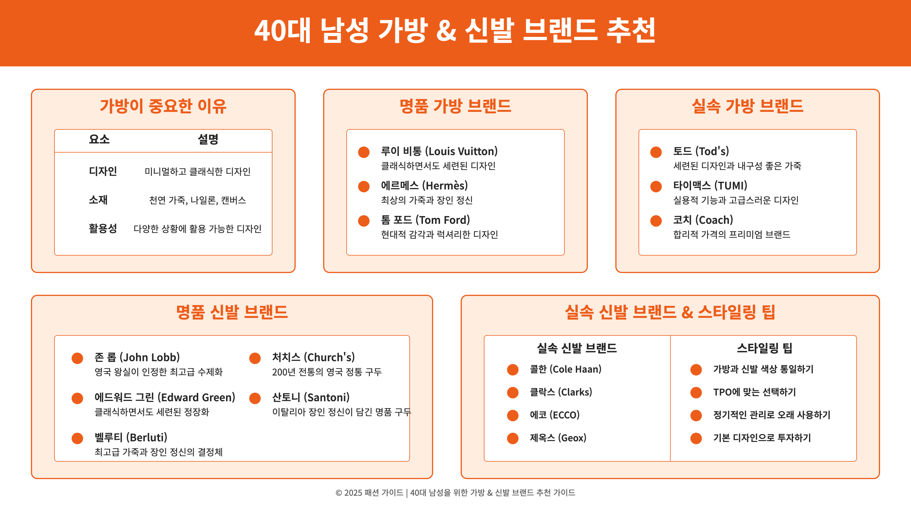 품격 있는 스타일의 완성은 가방과 신발에서 시작됩니다. 40대 남성을 위한 최고의 브랜드를 소개합니다.