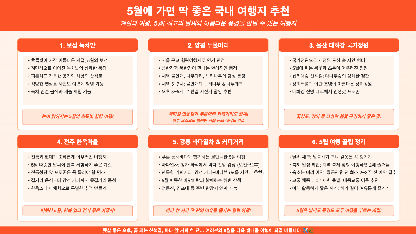 지금 아니면 못 떠나요! 5월은 날씨도 풍경도 모두 여행을 부르는 계절이에요. 이번에 소개해드린 국내 여행지들 중 한 곳이라도 들러보신다면 후회 없는 봄날을 보내실 수 있을 거예요. 햇살 좋은 오후, 꽃 피는 산책길, 바다 앞 커피 한 잔... 여러분의 5월을 더욱 빛내줄 여행이 되길 바랍니다. 지금 바로 여행 가방 꺼내보세요! ✈️🌿